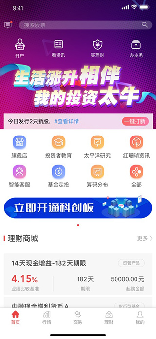 1、打开APP首页,即可直达太平洋研究、基金定投、智能客服等核心服务模块,一站式满足投资所需。