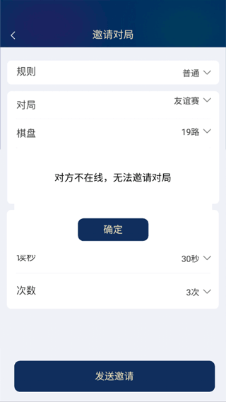 第一步,在首页点击右上角搜索图标;第二步,在搜索框中输入对方账号名称并执行搜索;第三步,进入其个人主页后点击“邀请对局”;第四步,设置对弈规则(包括棋盘路数、执子方式、棋份、时限、读秒等),确认后发送邀请。注意:对方必须在线才能接收邀请。