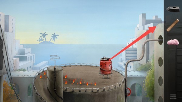 当你手持道具时,可在场景中寻找可互动的位置。例如,拿起锤子敲击钢管,触发机关。