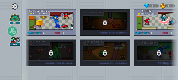 首次进入游戏后,点击转盘即可每日免费抽奖一次;获得的金币可用于购买心仪的角色皮肤;选择皮肤后,挑选游戏模式并等待加载,即可正式进入Spooky Park。游戏左上方会实时显示当前任务目标,如“寻找积木”或“修理机器”,按提示完成即可推进剧情。