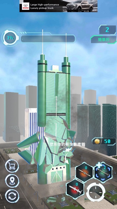 游戏采用直观的触控操作方式,新手也能快速掌握核心玩法。首先,在屏幕右下角选择你想要使用的武器类型;接着,点击目标建筑进行锁定;最后,轻触白色“瞄准镜”图标,即可发射导弹,见证建筑轰然倒塌的震撼瞬间。