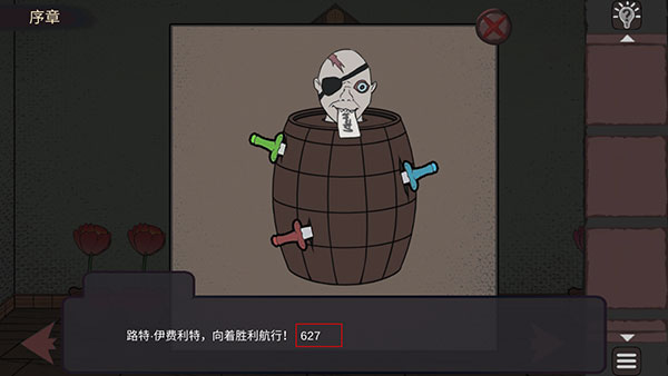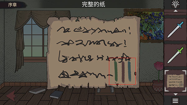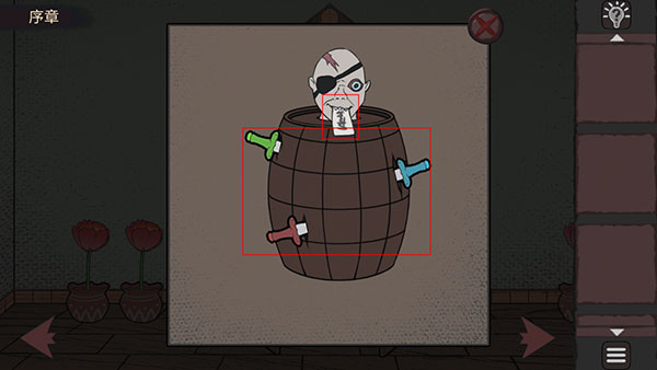 9、返回电视机所在场景,点击酒桶,按照左绿、中红、右蓝的顺序插入对应手柄剑,酒桶中的“人”会吐出一张纸条。