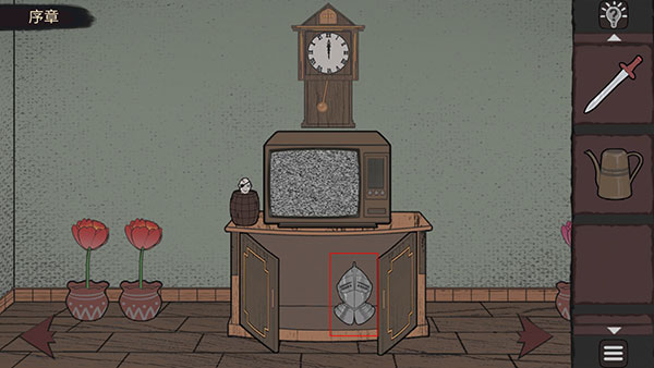 4、继续向右切换场景,将头盔放置于盔甲上,随即获得绿色手柄剑。