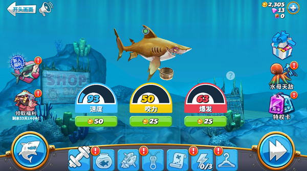 游戏中目前解锁鲨鱼的方法只有两种:1、直接使用钻石购买;2、积分条满了(进行游戏就能获得积分)之后解锁该型号的鲨鱼,然后在使用金币购买。