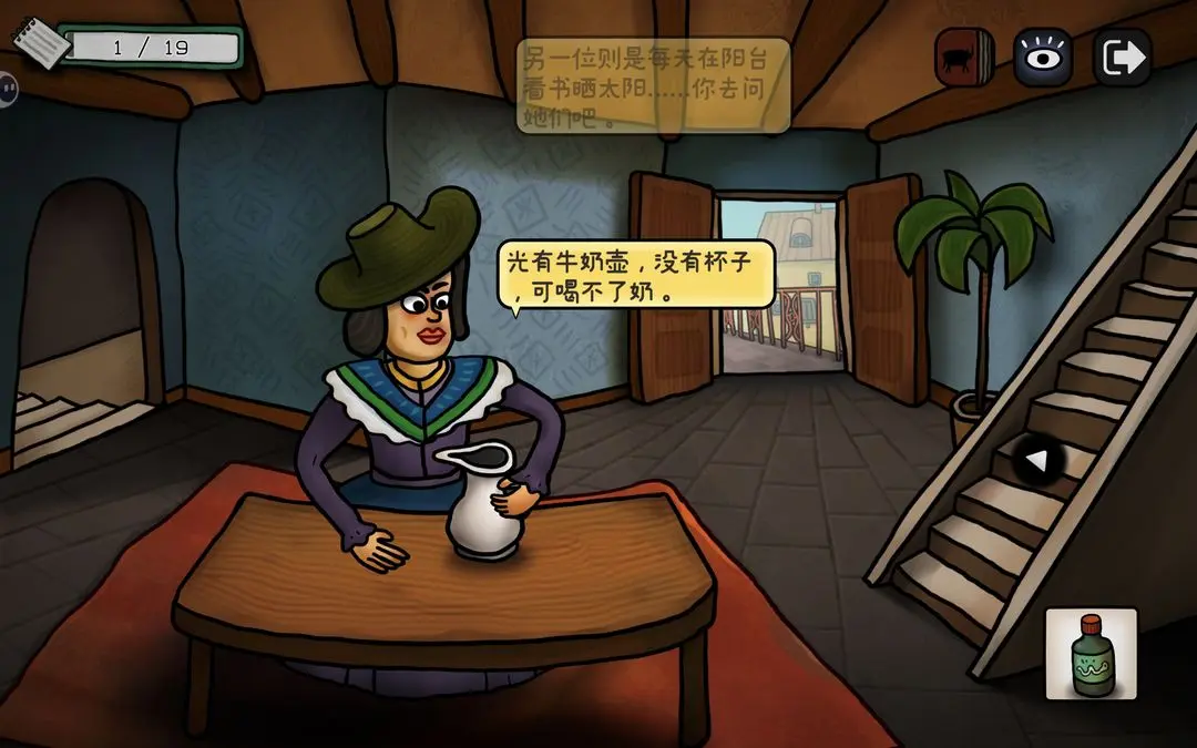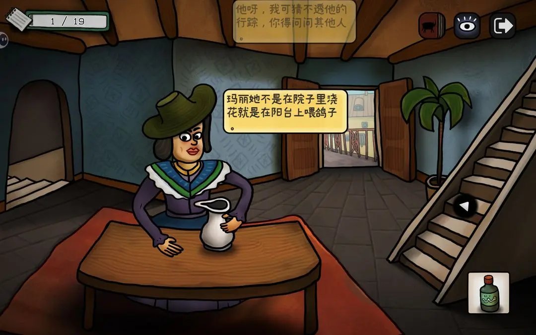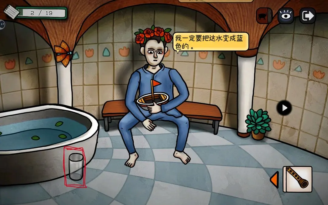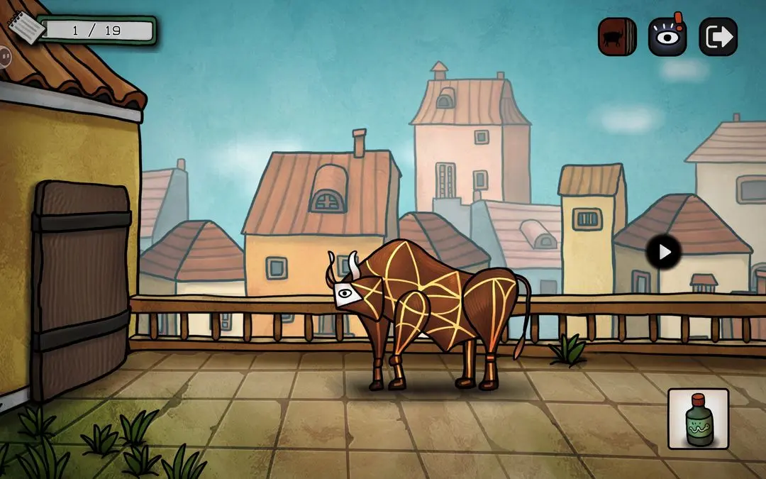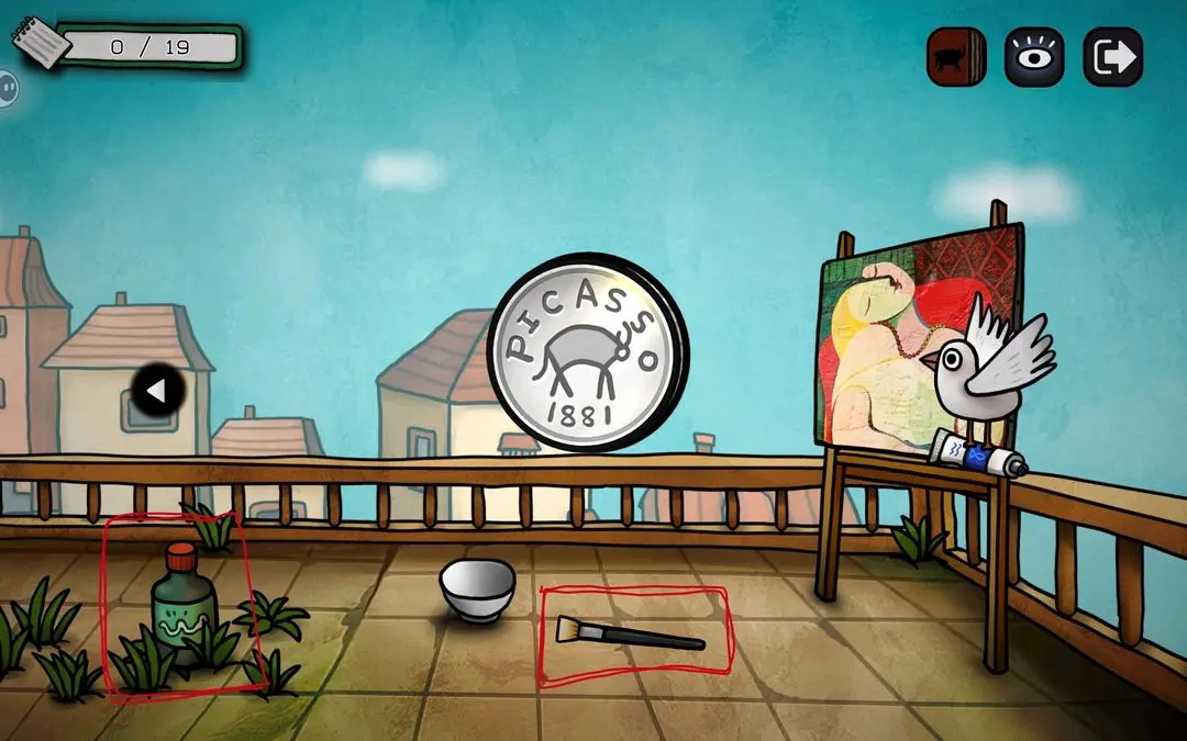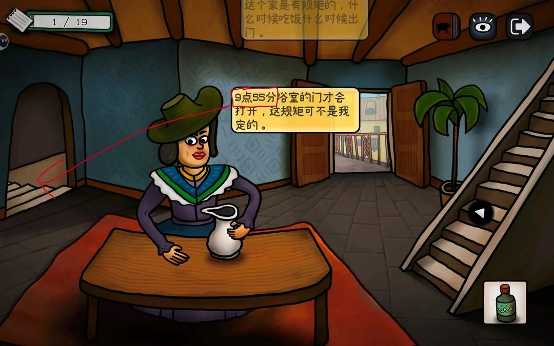 游戏初期可按以下步骤推进主线:点击花瓶获取钳子,用其剪断锁链;随后小鸟会抓走蓝颜料,进入屋顶拾取画笔与杀虫剂;将画笔交给阳台上的公牛,触发铅笔气泡框,连接所有端点即可解锁成就【一大步】;公牛随后撞开房门,进入室内与女子对话,获得关键线索——浴室门9:55开启、需喂鸽子、为女子提供杯子等。