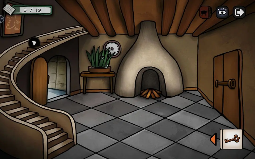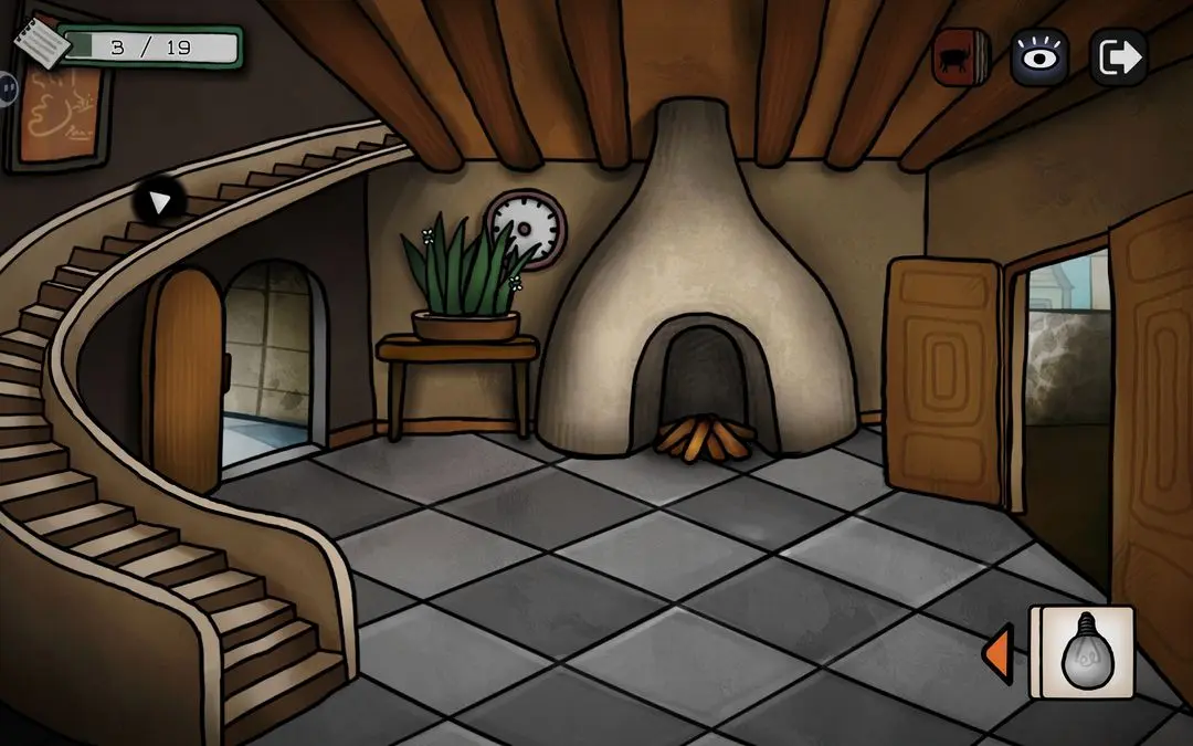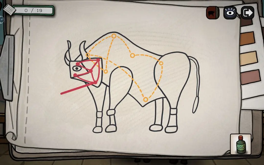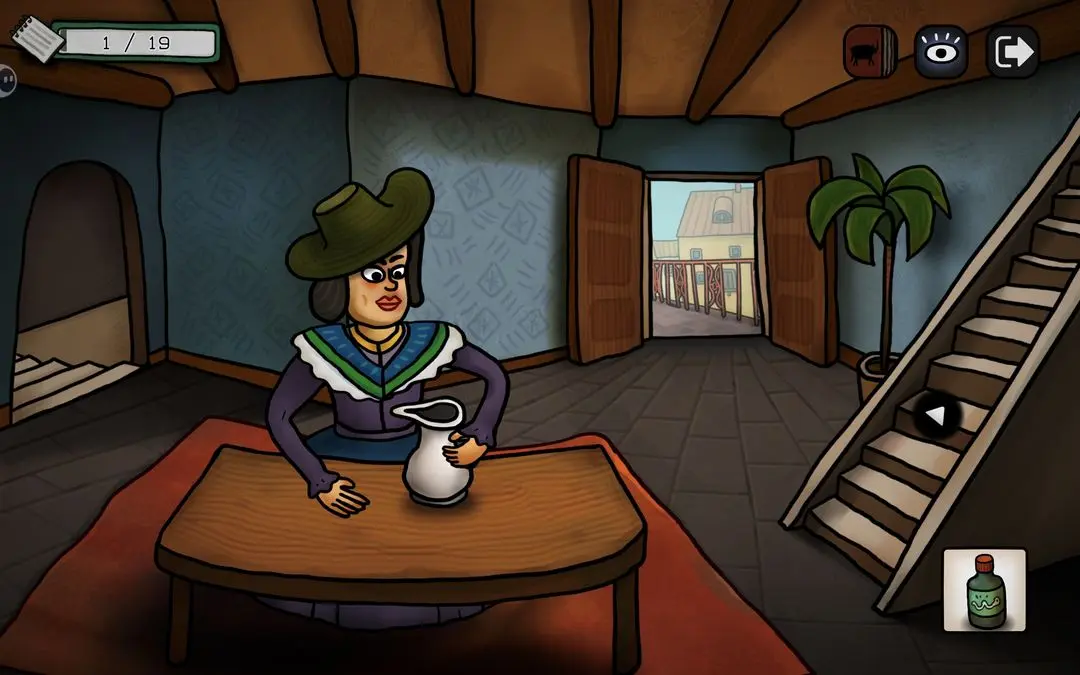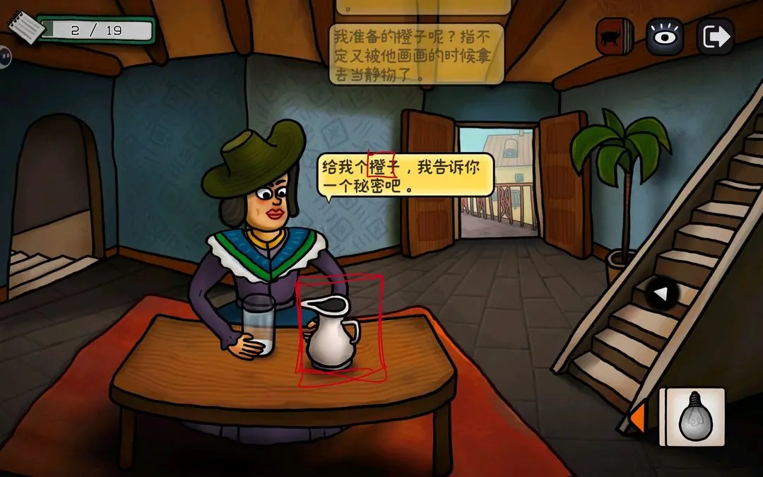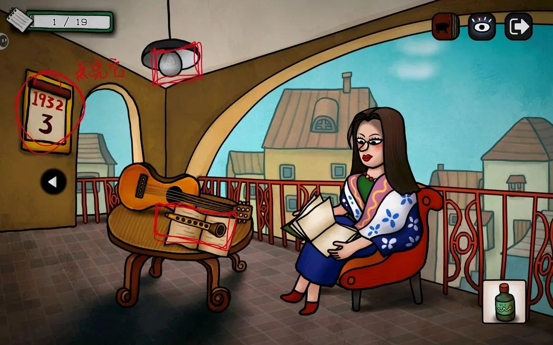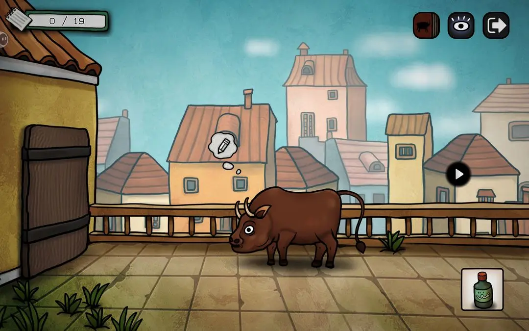 游戏初期可按以下步骤推进主线:点击花瓶获取钳子,用其剪断锁链;随后小鸟会抓走蓝颜料,进入屋顶拾取画笔与杀虫剂;将画笔交给阳台上的公牛,触发铅笔气泡框,连接所有端点即可解锁成就【一大步】;公牛随后撞开房门,进入室内与女子对话,获得关键线索——浴室门9:55开启、需喂鸽子、为女子提供杯子等。