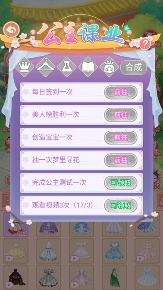 完成“公主课业”是获取限定套装的重要途径。玩家需集齐皇冠、衣架、拉链、书本、皇上五种卡片,即可随机兑换一套精美公主服饰。每日通过完成指定任务可获得随机卡片,部分任务(如观看视频)每日最多可完成三次,重复参与提升收集效率。