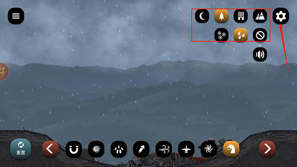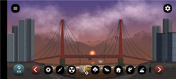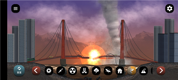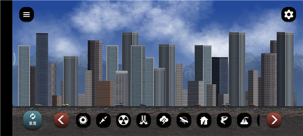 安装完成后,打开游戏即可直接进入主界面。点击左下角“重置”按钮,选择你喜欢的城市背景(如第三个预设场景)。随后,从底部灾难栏中任选一种灾难类型,点击城市任意位置即可触发破坏效果。此外,点击右上角设置图标,还能自定义季节与背景,打造专属的末日舞台。