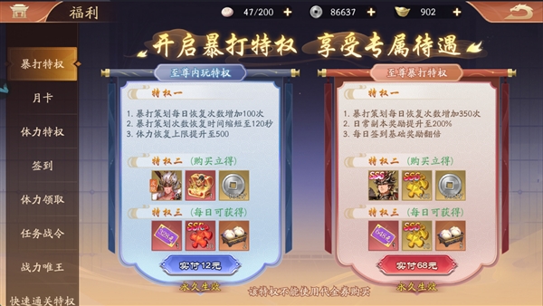 微氪玩家优先入手“暴打特权”与“白银至尊月卡”:前者直接赠送吕布、红装皮肤及500体力上限,加速开荒节奏;后者提供稳定体力与资源,助力早期拿下SSS UR武将。