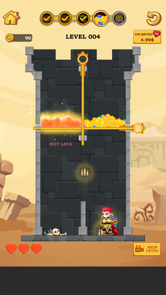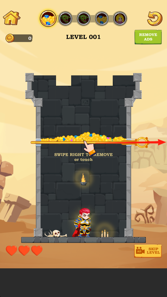 在《英雄救援》中,你的主要操作是“拉动销钉”——看似简单,实则暗藏玄机。你需要精准判断时机与顺序,在释放机关、清除障碍(如蜘蛛等敌人)的同时,确保英雄安全抵达公主所在位置,并顺手夺取珍贵宝藏。随着关卡深入,路径更复杂、机关更密集,稍有不慎就可能功亏一篑。