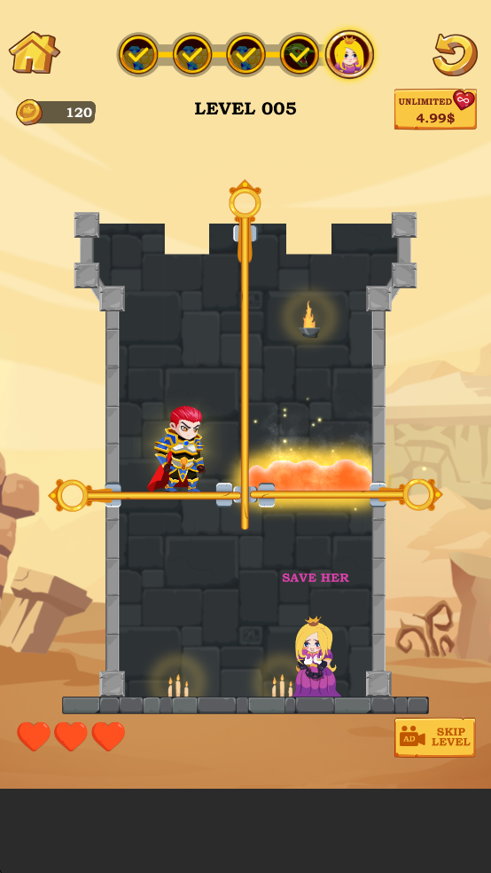 《英雄救援》提供数以千计的关卡,持续更新,绝不枯燥。从初期教学关卡到后期高难度谜题,节奏循序渐进,满足不同玩家的挑战需求。更令人惊喜的是,当你累计通关一定数量后,将解锁专属“拯救公主”剧情关卡,让冒险更有目标感与成就感。