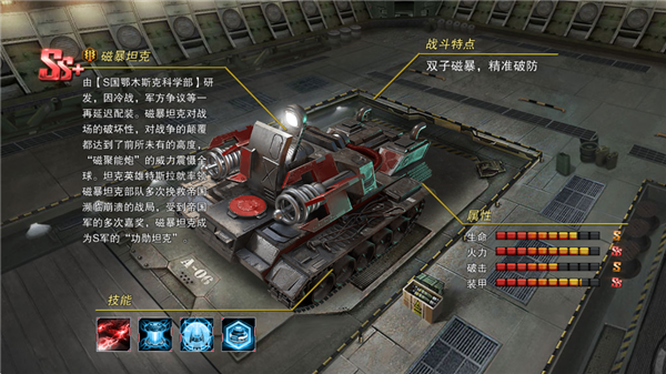 出自【S国鄂木斯克科研机构】的磁暴坦克,搭载革命性“磁聚能炮”,可对战场环境造成颠覆性破坏。在英雄特斯拉的率领下,曾多次力挽狂澜,扭转帝国战局,被授予“功勋坦克”最高荣誉。
